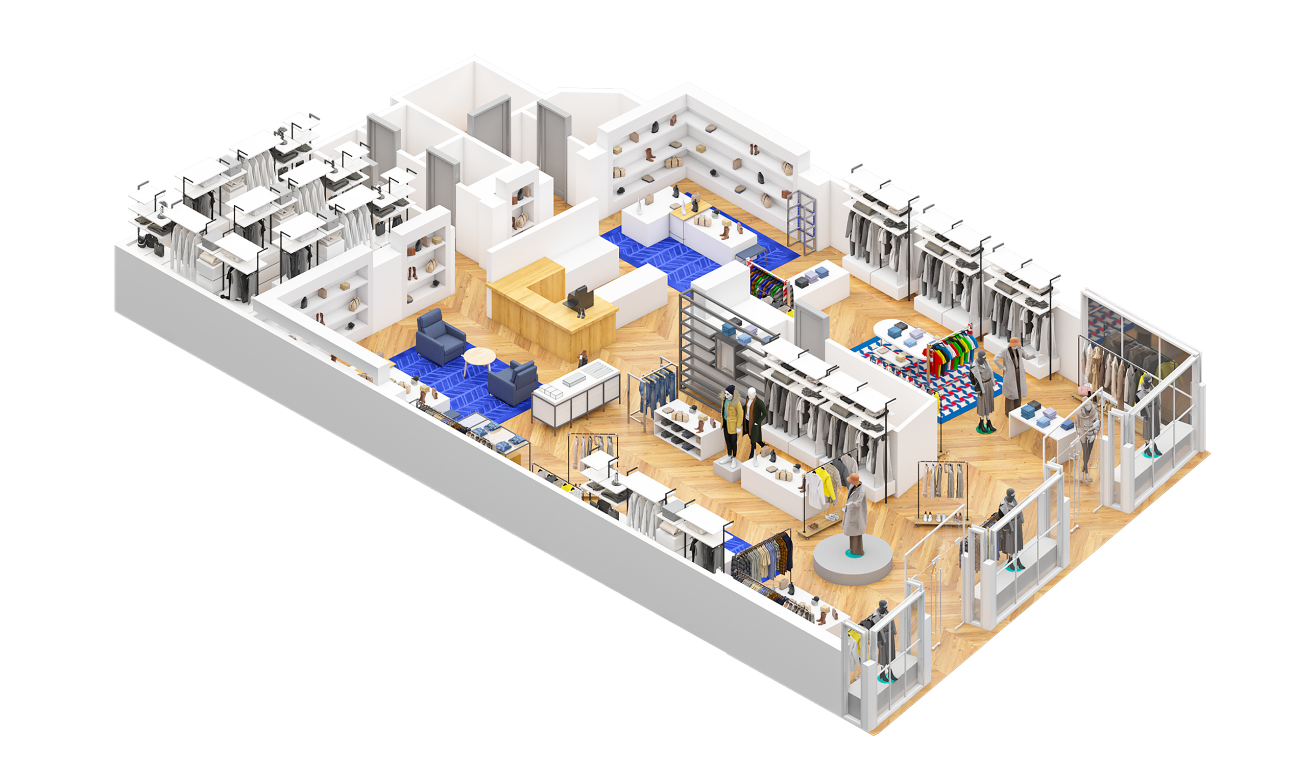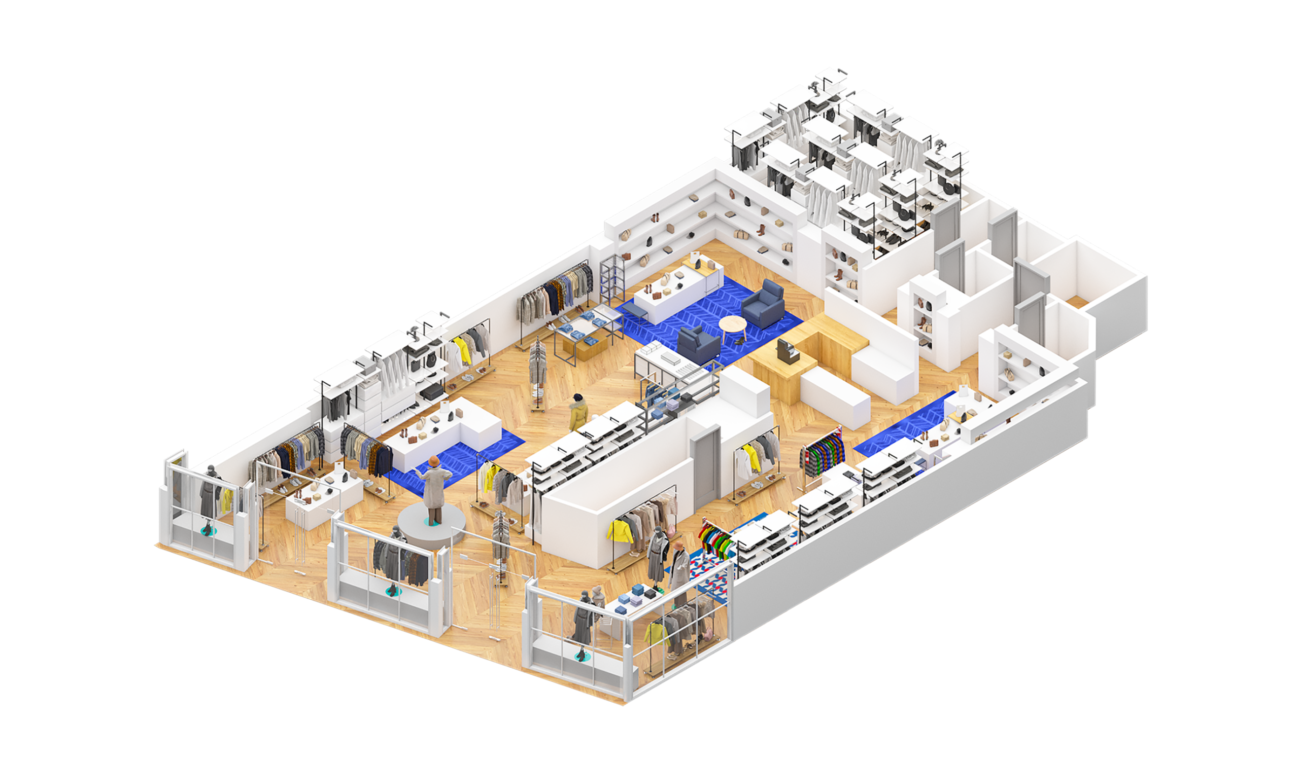 Ongoing 3D floor plans for global retail brands, visualizing shop fit-outs, racks, and storage layouts with precision.